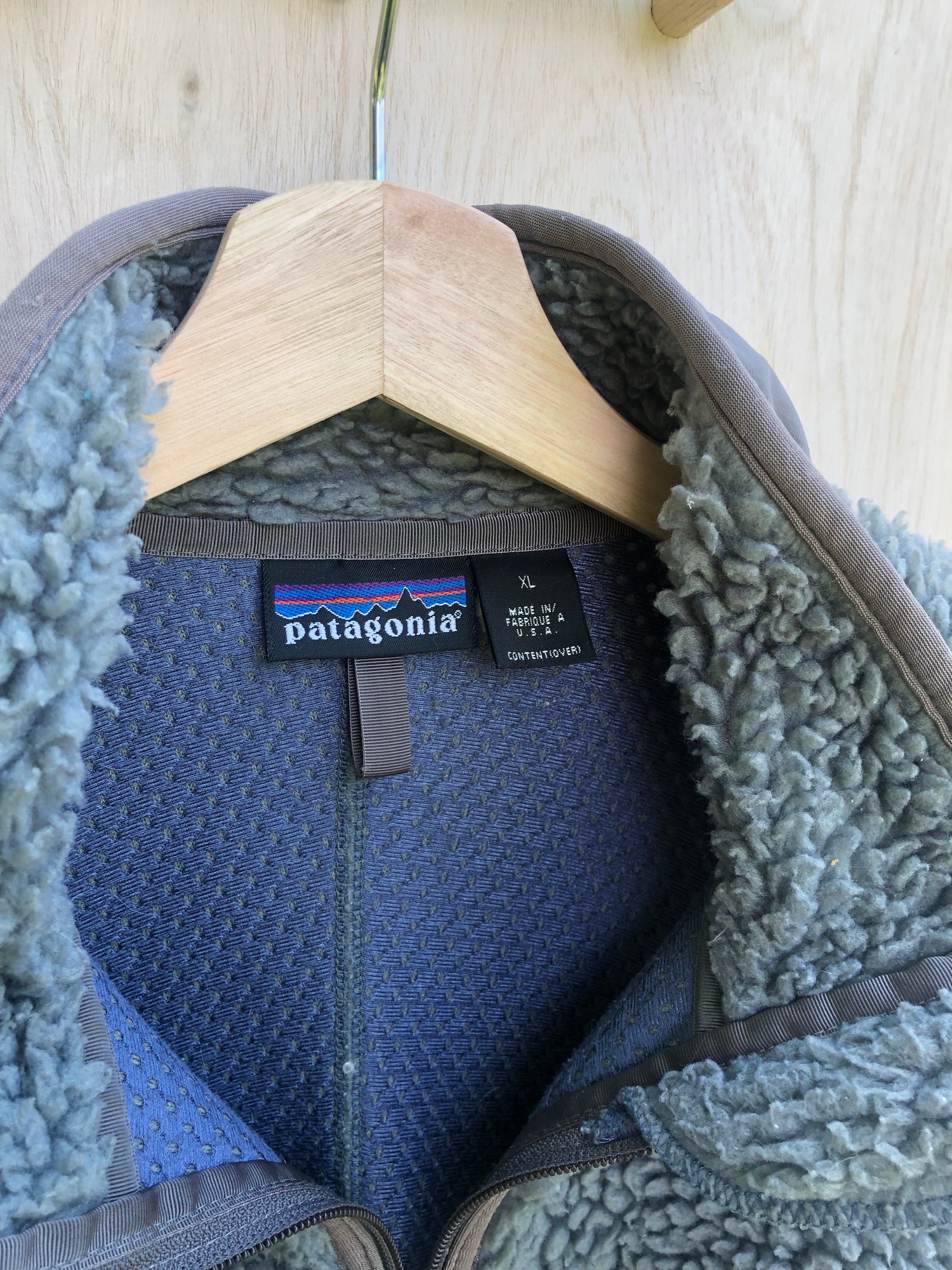 Condition: Well-loved. Has typical fleece wear including pilling and elbow/cuff matting, as well as two nickel-sized superficial marks. One on the front of garment below the zippered pocket, the other on the back of the left sleeve.