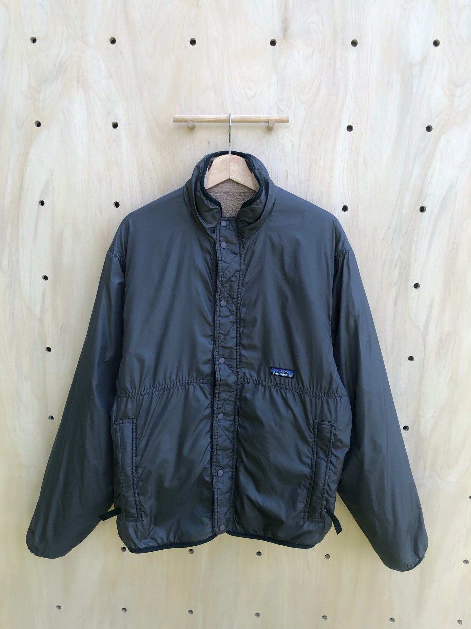 Rare reversible Glissade from the '90s. Beige deep pile on one side and a smooth dark grey nylon face on the other. Each side has two hand pockets and the fleece side has a zippered chest pocket. Made in USA.