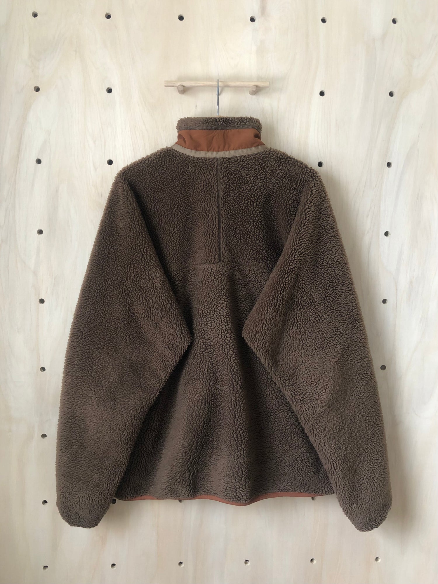 Classic Patagonia Retro-X Cardigan in a woodsy brown fleece with orange accents. Windproof and warm, yet breathable, fabric.